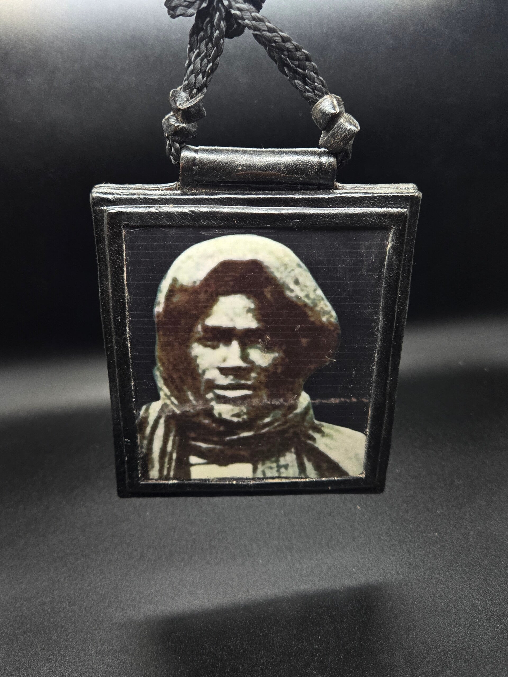 BayeFall Studio Djhills, spiritual leather amulet, Khassida talisman, cultural protection necklace, African spiritual amulet, handmade Djhill necklace, saint picture talisman, protective leather amulet, spiritual heritage jewelry, artisan Djhill necklace, Khassida spiritual amulet, cultural leather talisman, spiritual necklace with Khassida, African cultural talisman, handmade spiritual protection necklace.